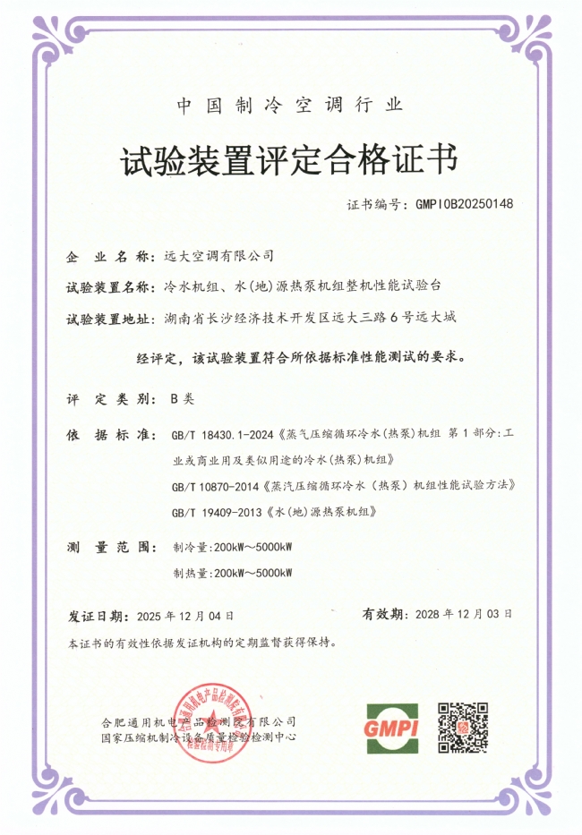 冷水机组、水(地)源热泵机组整机性能试验台合格证书