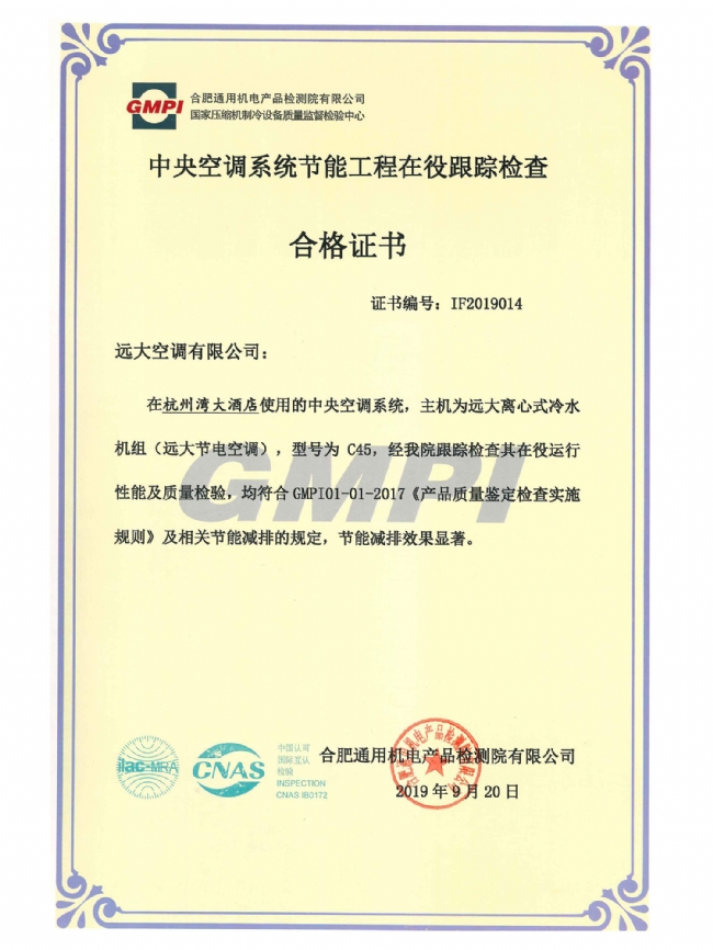 中央空调系统节能工程在役跟踪检查合格证书_C45