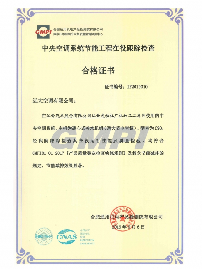 中央空调系统节能工程在役跟踪检查合格证书_C90