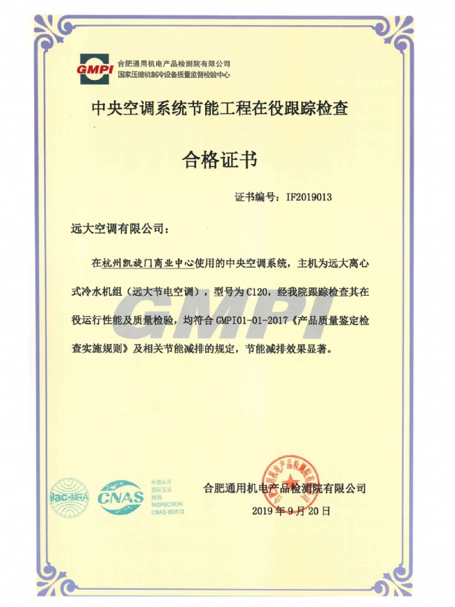 中央空调系统节能工程在役跟踪检查合格证书_C120