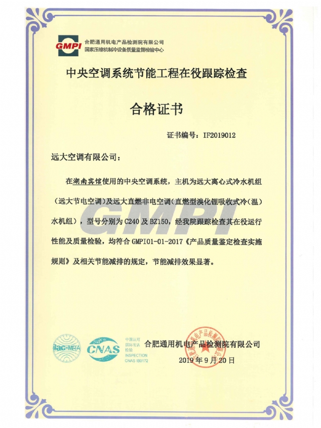 证书名称:中央空调系统节能工程在役跟踪检查合格证书