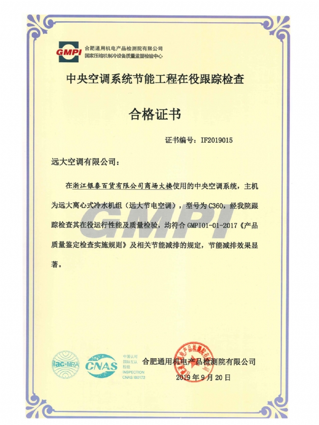 中央空调系统节能工程在役跟踪检查合格证书_C360