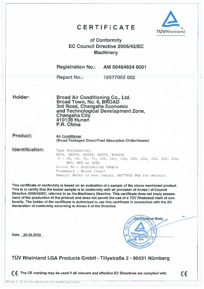 一体化直燃型非电空调MD证书